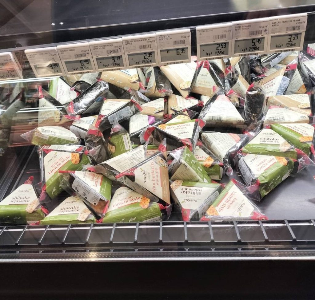 ベルリン中央駅の構内にある REWEのお店では、おにぎりを見つけました。2.99ユーロです。醤油しいたけ、韓国キムチ、てりやきチキン、鮭わかめなどが見えます。