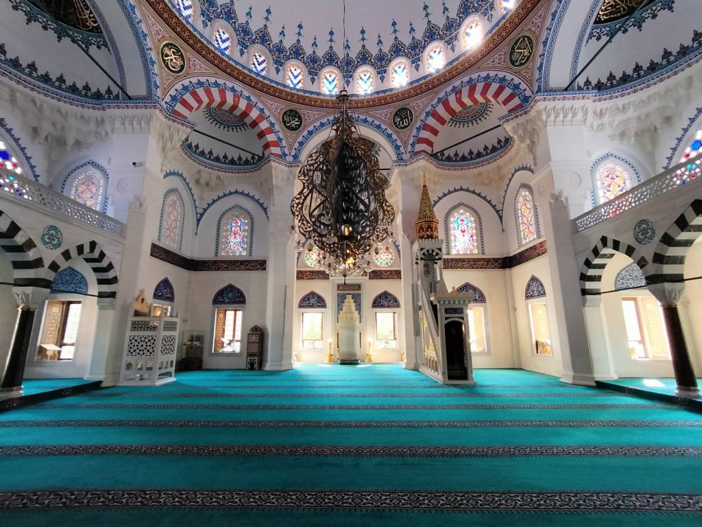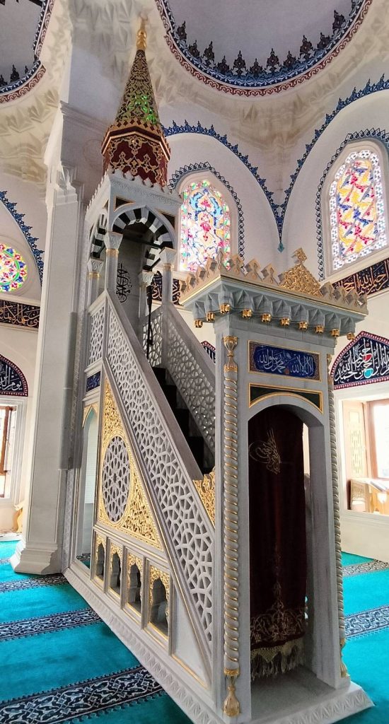 こちらは男性のための礼拝室で、1階には女性用の礼拝室もあります。スピーカーで、どこにいてもコーランの読み上げや説教が聞こえるようになっています。男性の礼拝室を取り囲む2階部分は、女性の入場が許可されているそうですが、この日、女性はひとりも姿を見せませんでした。1階で礼拝されていたようです。ちなみに、女性は指導者にはなれないのだそうです。