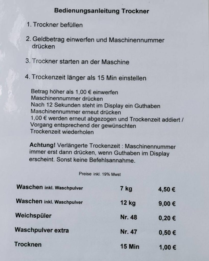 一般のコインランドリーを見に行くと、今のところは、洗濯7kgが4.50ユーロ(830円余り)、12kgだと9ユーロ(約1665円)、乾燥機が15分ごとに1ユーロ(約185円)とありました。
