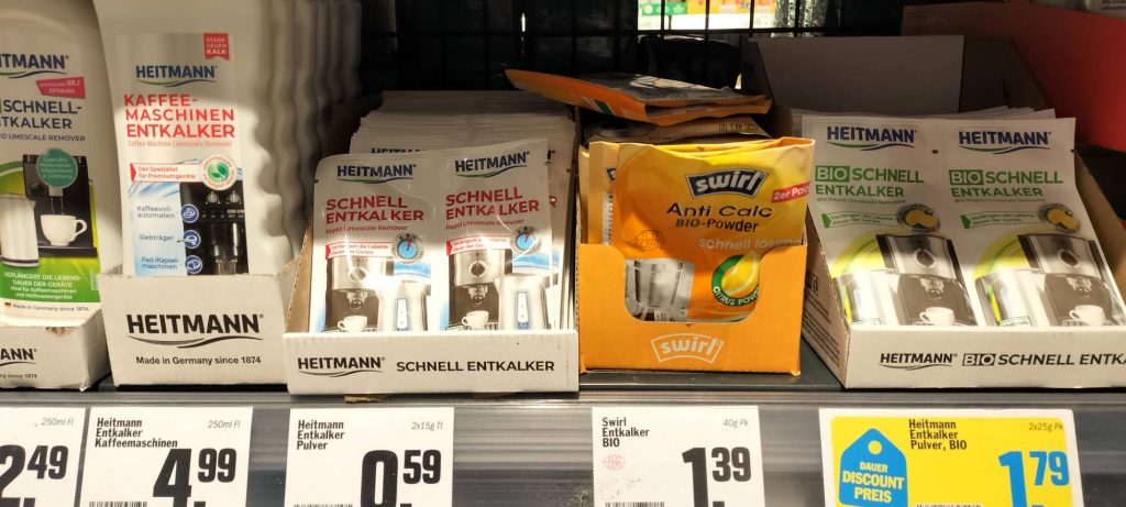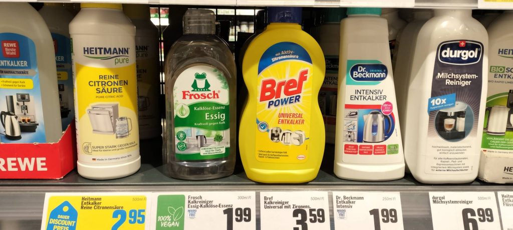 すると、あること、あること、小さなスーパーなのに、こんなにいろいろな種類の台所用カルキ除去剤がありました。